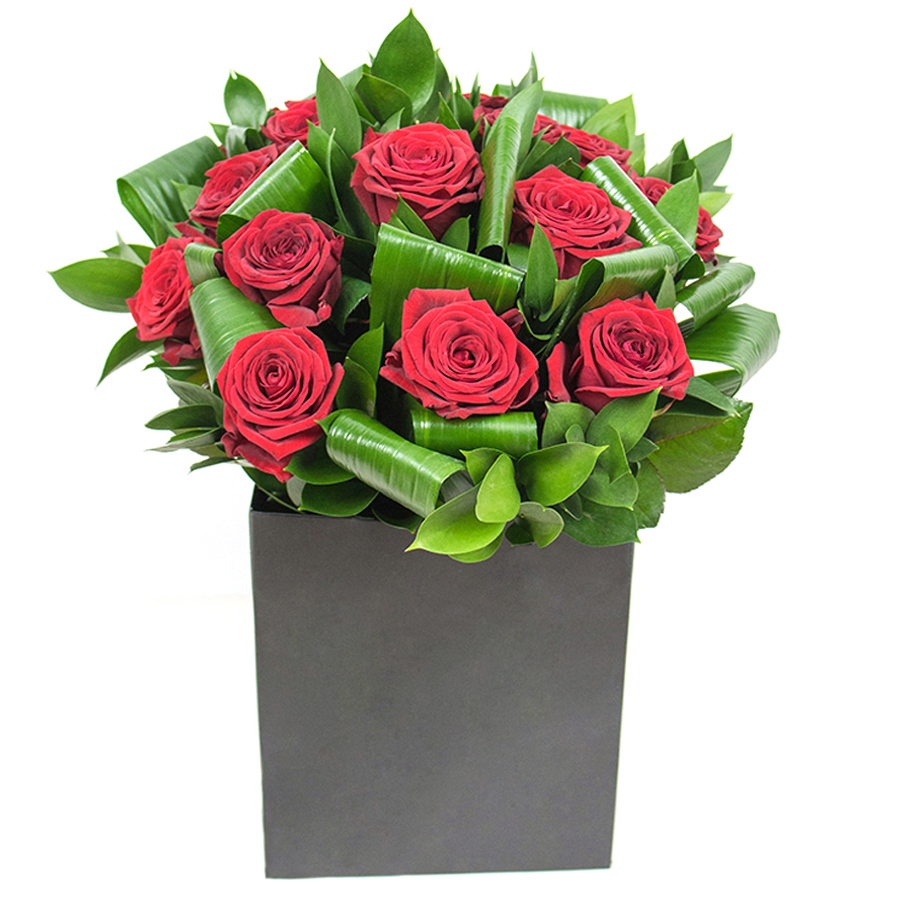 Transform any room with our beautiful bouquet of red roses, enhanced with aspidistra leaves and ruscus for a touch of sophistication and charm.